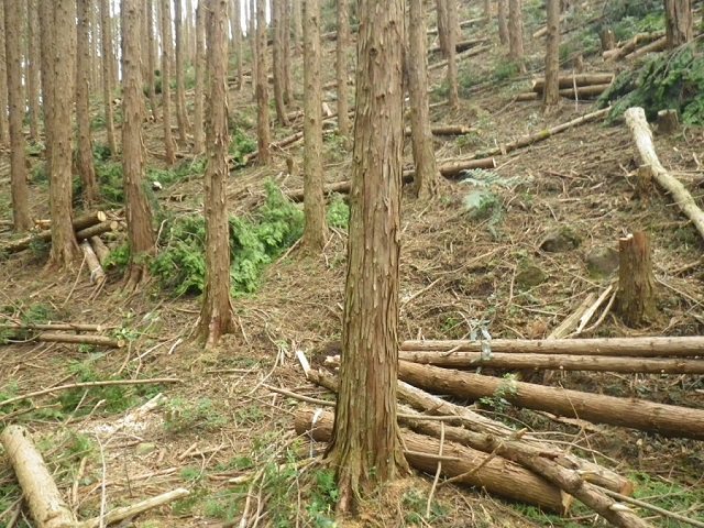 同時に行う搬出間伐と、作業範囲内の木を全て伐採、搬出する皆伐(全伐)があります。